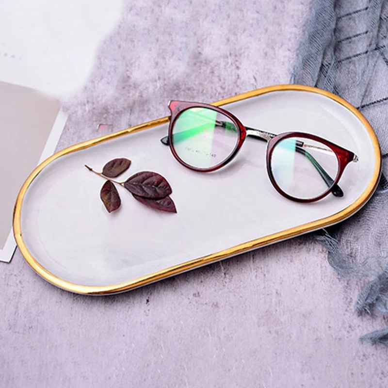 HOT Sale Gold-Plated Ceramic Marble Storage Tray European Food Fruit Breakfast Oval Plate Jewelry Tray Desse