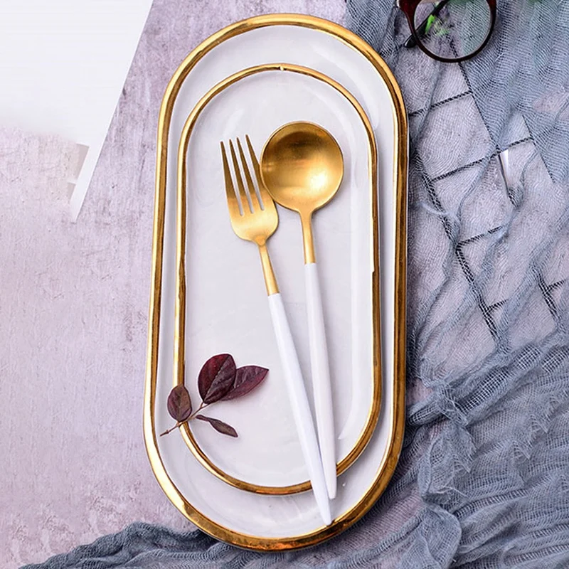 Gold-Plated Ceramic Marble Storage Tray European Food Fruit Breakfast Oval Plate Jewelry Tray Desse
